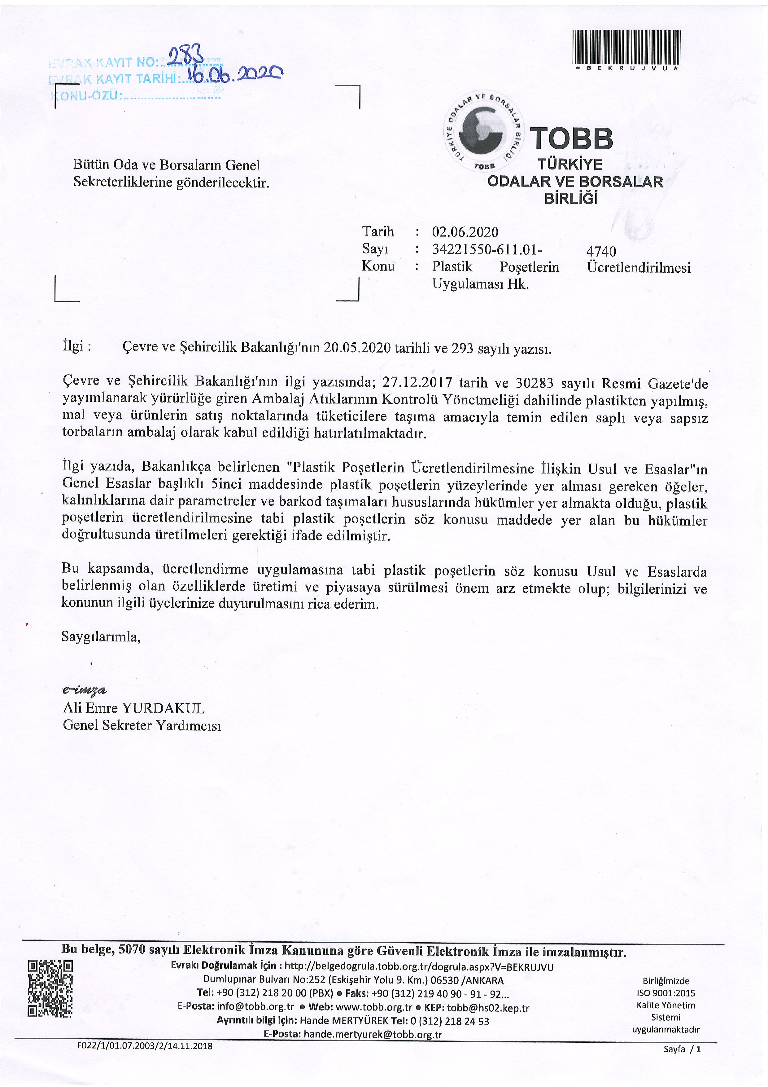 PLASTİK POŞETLERİN ÜCRETLENDİRİLMESİ UYGULAMASI HK.