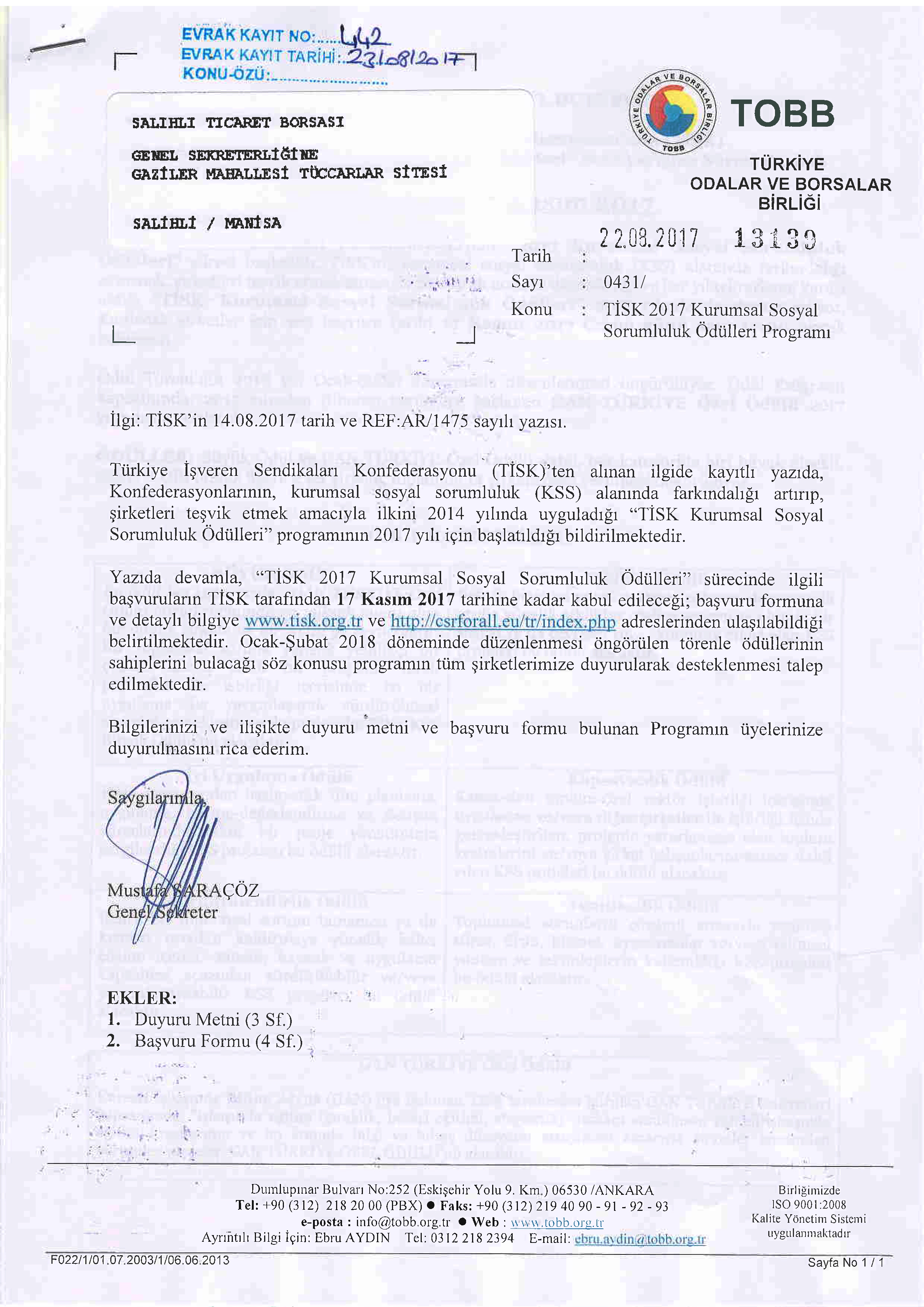 TİSK 2017 SOSYAL SORUMLULUK PROJELERİ ÖDÜLLERİ PROGRAMI HK.